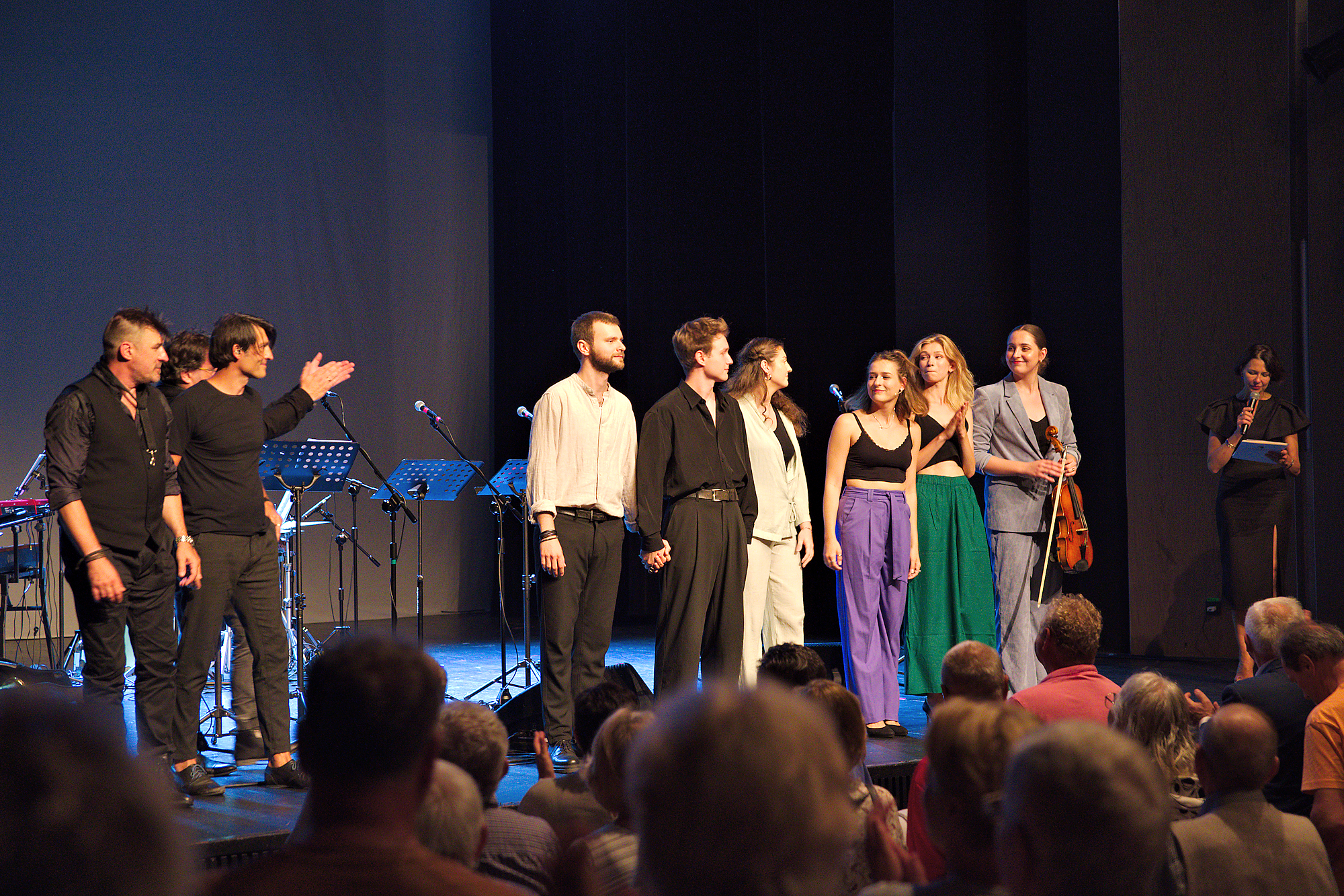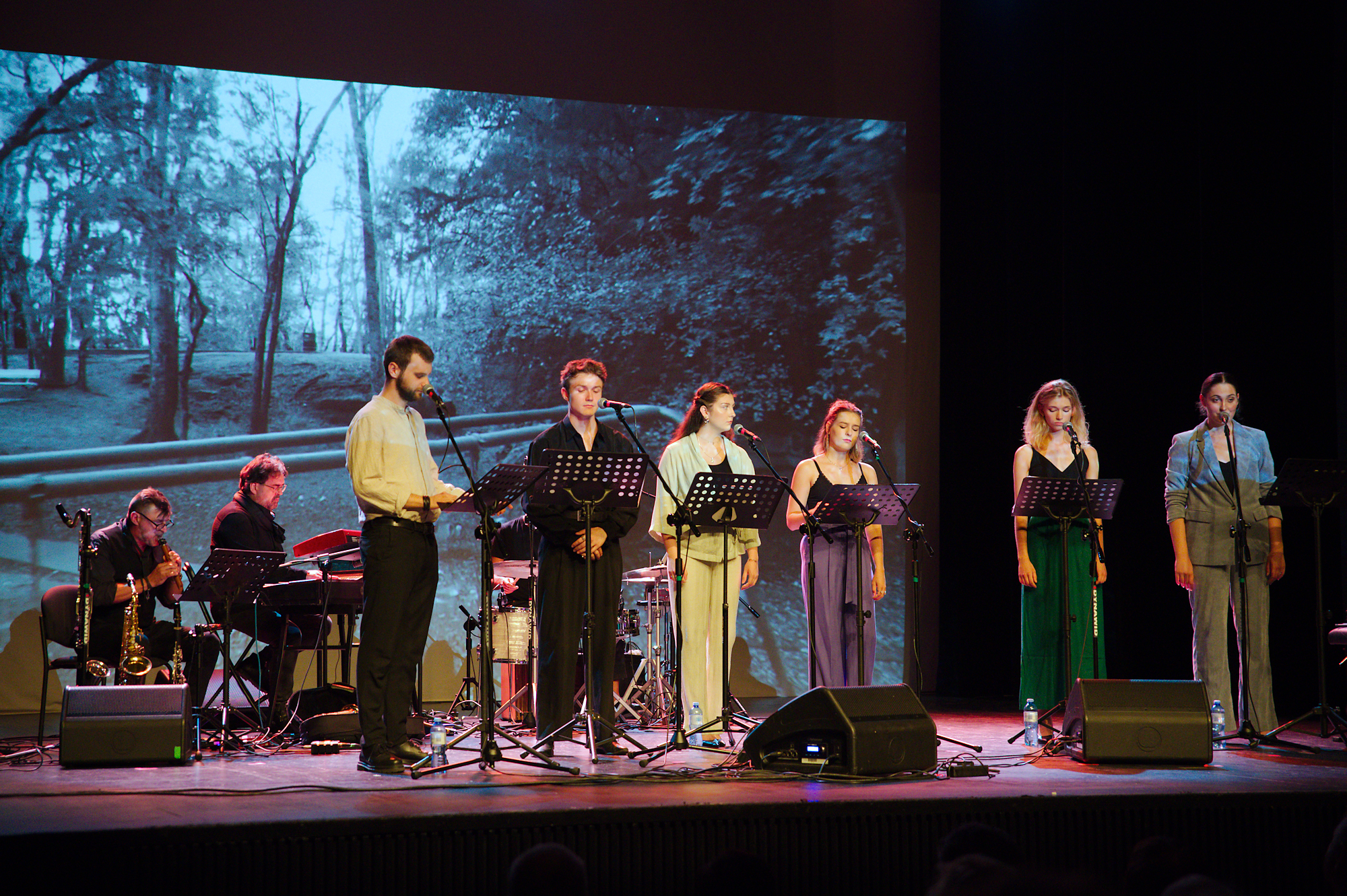 Po krótkiej przerwie nadeszła pora na ostatnie danie sierpniowej odsłony tegorocznej Herbertiady. Za sześcioma mikrofonami stanęła urodziwa gromadka studentów aktorstwa z Warszawy: Martyna Burchała, Mary Pawłowska, Urszula Rossowska, Marta Noemi Tabęcka, Mateusz Tomaszewski i Marek Zawadzki. Obok nich rozlokowało się trzech instrumentalistów: Piotr Maślanka za perkusją (choć grał także na innych instrumentach, na przykład na butelkach...), Mario Jeka ze swoimi klarnetami i wschodnim dudukiem) oraz przy klawiszach Hadrian Filip Tabęcki – główny sprawca całego zamieszania, reżyser i kierownik muzyczny koncertu, zatytułowanego „Podróże Pana Cogito” i zadedykowanego Katarzynie Pechman. Historia opowiedziana i wyśpiewana przez wykonawców koncertu za punkt wyjścia i oś, wokół której wirowały emocje, miała wybrane fragmenty wiersza „Podróż”, obszernego i wielowątkowego tekstu Herberta, w którym tytułowa podróż jest zarówno zmysłowym zanurzaniem się w żywiołach, jak drogą w głąb siebie, w głąb języka i historii, piękna i tajemnicy, a przede wszystkim w głąb człowieka i wszystkich jego ojczyzn i obczyzn. Przez salę widowiskową kołobrzeskiego centrum kultury popłynęły rozmaite formy muzyczne – od kameralnych ballad po gospelowe eksplozje, od czystego liryzmu po kontrolowany wygłup. Na program składały się znane – choć na nowo muzycznie odkrywane – kompozycje Przemysława Gintrowskiego, nowsze, interesujące utwory Miłosza Wośki oraz oryginalne kompozycje Hadriana Filipa Tabęckiego, razem tworząc spójną całość dzięki muzycznemu warsztatowi i talentowi kierownika muzycznego oraz dzięki bujnym osobowościom urzekająco muzykalnej aktorskiej młodzieży. Czy można zatem dziwić się, że publiczność nagrodziła artystów owacją na stojąco a oni odwdzięczyli się powtórnym zaśpiewaniem piosenki „Kamyk”? Nie można!