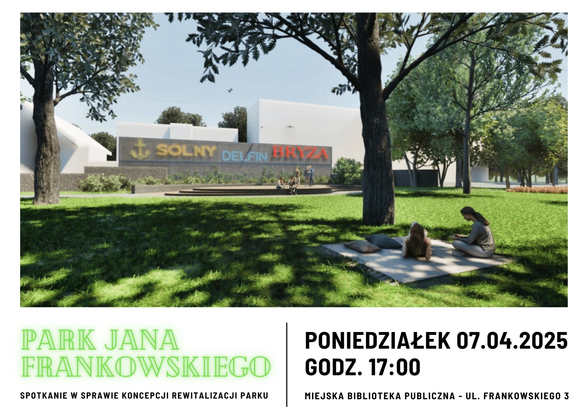 Zapraszamy mieszkańców Kołobrzegu na spotkanie, podczas którego przedstawiona zostanie koncepcję rewitalizacji parku przy ul. Jana Frankowskiego. Spotkanie odbędzie się w poniedziałek, 7 kwietnia, o godz. 17:00, w Miejskiej Bibliotece Publicznej im. Galla Anonima. Czekamy na Wasze opinie i obecność.