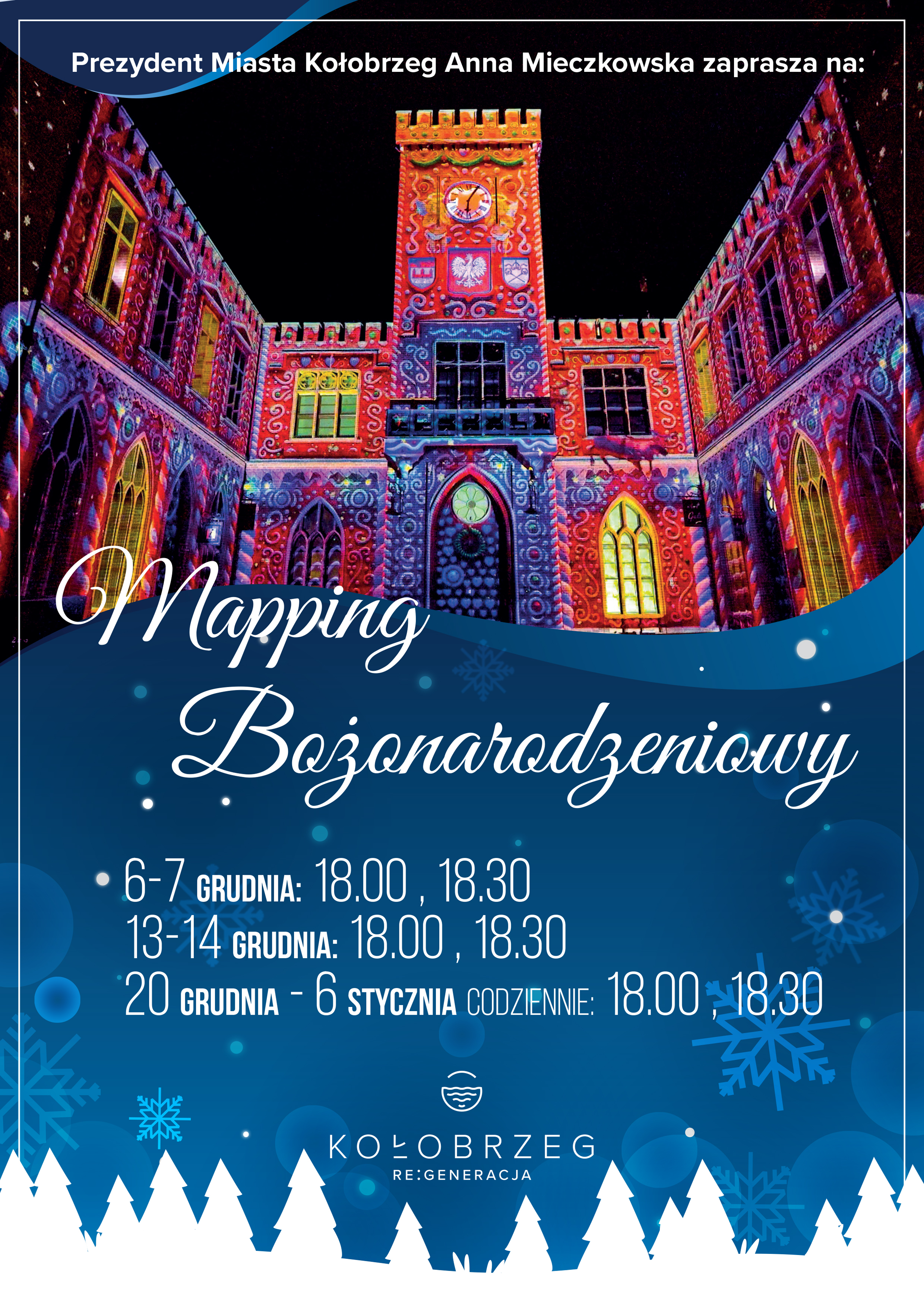 Świąteczny mapping jest emisją niezależną od dotychczasowych weekendowych projekcji. Pokazy o 19.30 w piątki i soboty będą kontynuowane bez zmian. W piątki wyświetlane są filmy: „Kultura” oraz „I love Kołobrzeg”, w soboty publiczność może oglądać trzy projekcje: „Historia”, „Adebar” oraz „Bój o Kołobrzeg”.