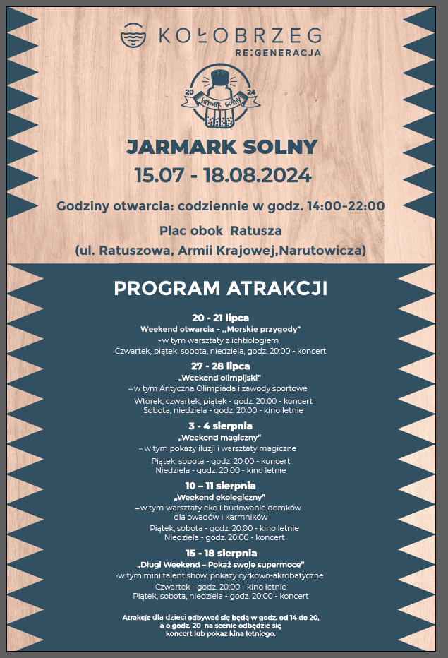 Jarmark jest cykliczną imprezą nawiązującą do tradycji jarmarków kupieckich, w tym o charakterze wystawienniczo–handlowym dla wytwórców regionalnych wyrobów użytkowych i artystycznych, naturalnych produktów spożywczych, przedmiotów sztuki i dawnych wyrobów użytkowych. Wydarzeniu towarzyszyć będzie cykl imprez artystycznych, które uatrakcyjnią jego przebieg i przyciągną do Centrum mieszkańców i turystów. Będą to między innymi animacje dla dzieci ułożone w pięć weekendów tematycznych, koncerty na scenie oraz kino letnie.