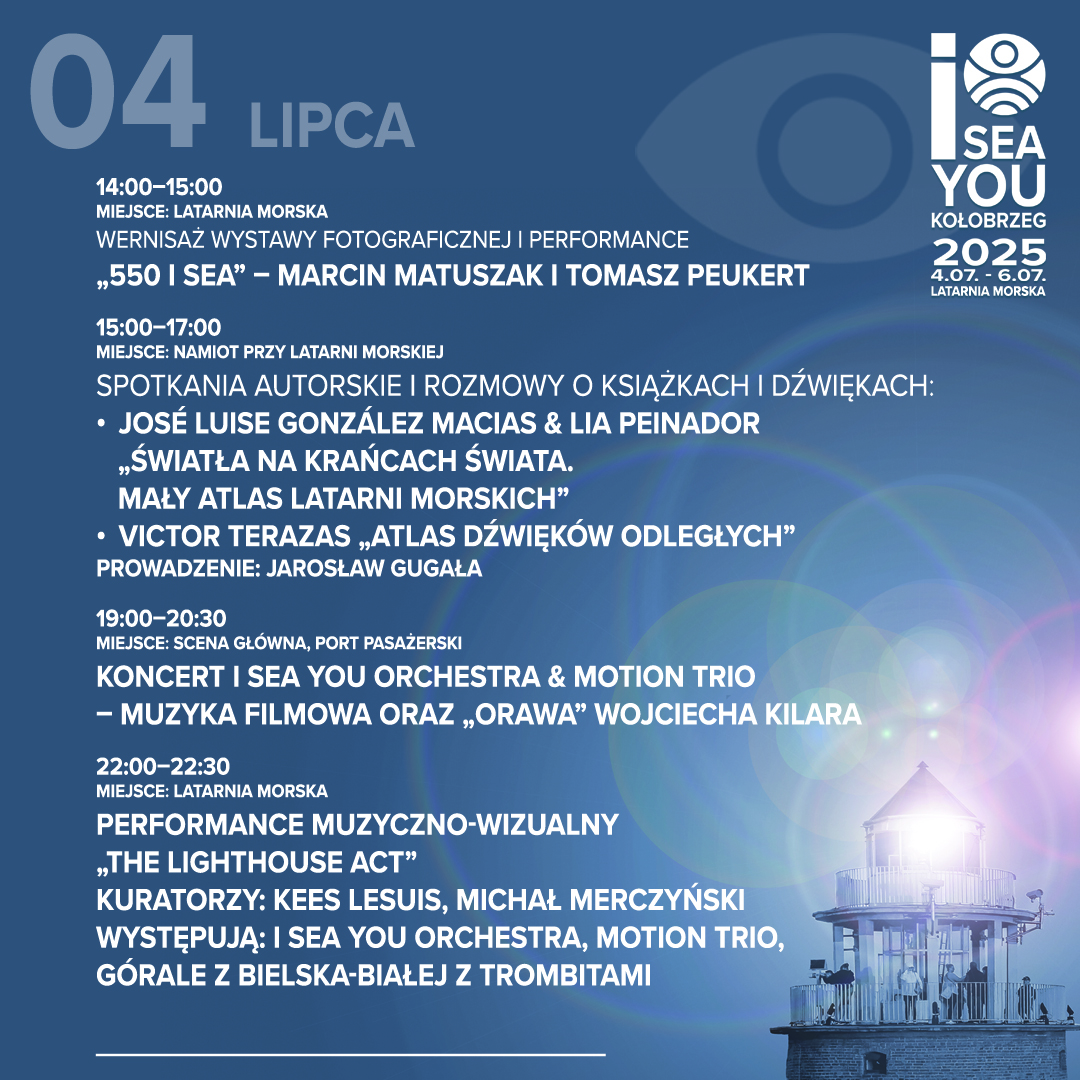 Festiwal rozpocznie się o godz. 14:00 wernisażem wystawy fotograficznej „550 I SEA" autorstwa Marcina Matuszaka i Tomasza Peukerta – wyjątkowe połączenie obrazu i dźwięku w przestrzeni kołobrzeskiej latarni. Wystawa „Kadrowanie wiersza”. Wiersz a fotografia. Uchwycenie świata, który przemija. Marcin Rurek i Poezja Żywa. Następnie, w namiocie przy latarni, odbędą się spotkania autorskie z wybitnymi twórcami literatury. Usłyszymy José Luisa Gonzáleza Maciasa i Lię Peinador, a także Victora Terazasa z jego zmysłowym „Atlasem dźwięków odległych”. Rozmowy poprowadzi dziennikarz i publicysta Jarosław Gugała. Wieczorem, na Scenie Głównej w Porcie Pasażerskim, zabrzmi muzyka filmowa w wykonaniu I SEA YOU ORCHESTRA i Motion Trio, z finałowym utworem „Orawa” Wojciecha Kilara. O 22:00 ponownie wrócimy do latarni, gdzie odbędzie się spektakularny performance muzyczny „THE LIGHTHOUSE ACT” z udziałem orkiestry, Motion Trio i górali z Bielska-Białej grających na tradycyjnych trombitach.