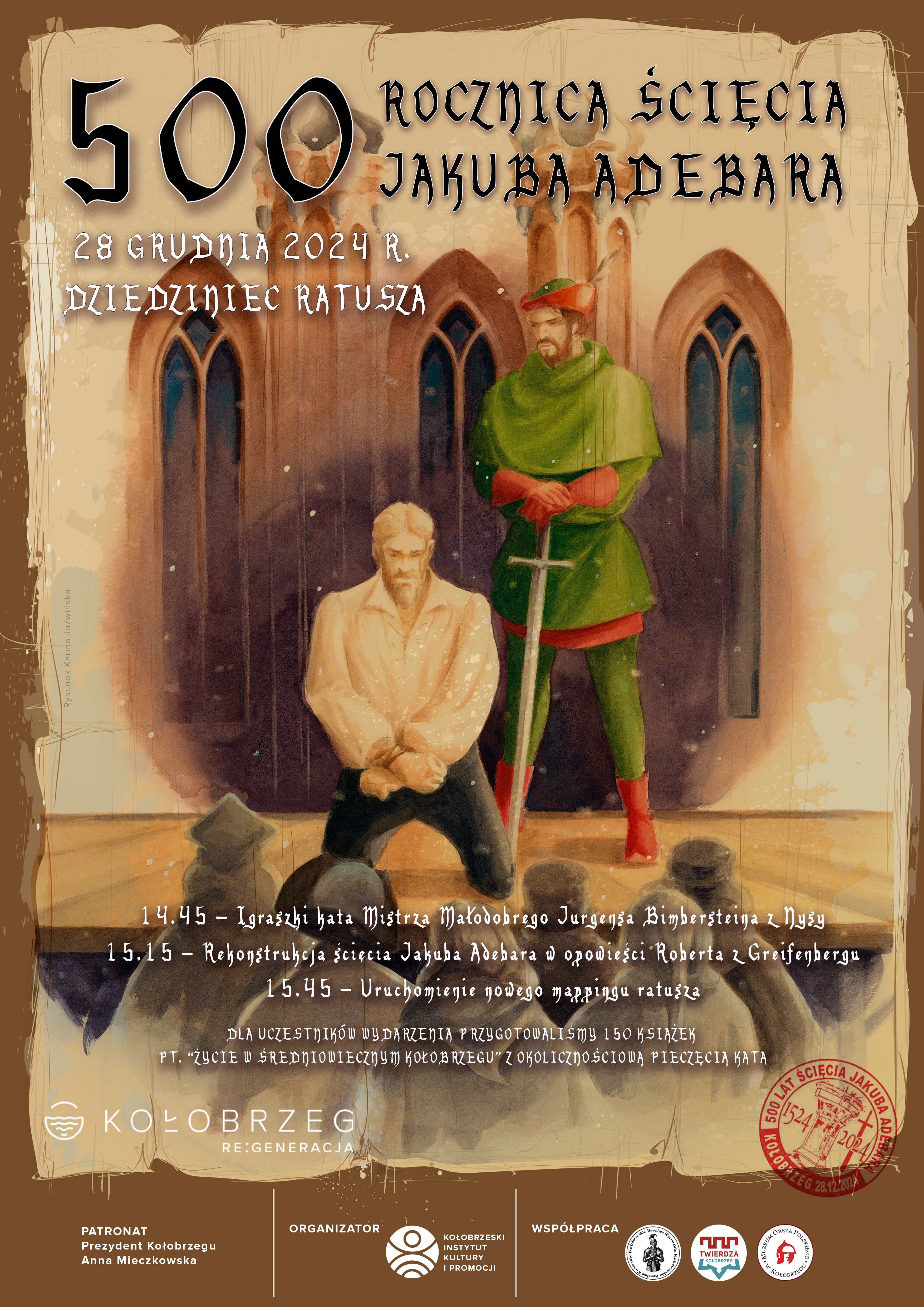 15:15 – Rekonstrukcja ścięcia Jakuba Adebara w opowieści Roberta z Greifenbergu. Następnie, w atmosferze zadumy, przeniesiemy się w sam środek historycznego dramatu. Robert z Greifenbergu, mistrz słowa i narracji, wciągnie nas w opowieść o tragicznej śmierci Jakuba Adebara, malując obrazy, które wstrząsną sercami słuchaczy. Usłyszymy o honorze, zdradzie i mrocznych tajemnicach, które towarzyszyły tej niezwykłej postaci.