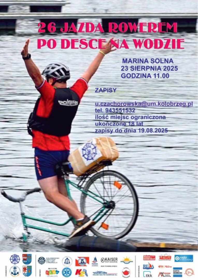 23 sierpnia po raz 26 w Marinie Solnej w Kołobrzegu odbędą się zawody "Jazda rowerem po desce na wodzie". Jak co roku uczestnicy będą mieli do przejechania dwudziestojednometrowy odcinek deski o szerokości trzydziestu centymetrów. Trasa ułożona jest na dętkach pływających po wodzie. To wyjątkowe wydarzenie połączy emocje związane z jazdą rowerem i wodnymi szaleństwami! Przygotowaliśmy dla Was niesamowite wyzwania, a także niezapomniane wrażenia. Oceniana będzie nie tylko jazda, ale i stylizacja i wygląd startujących zawodników.