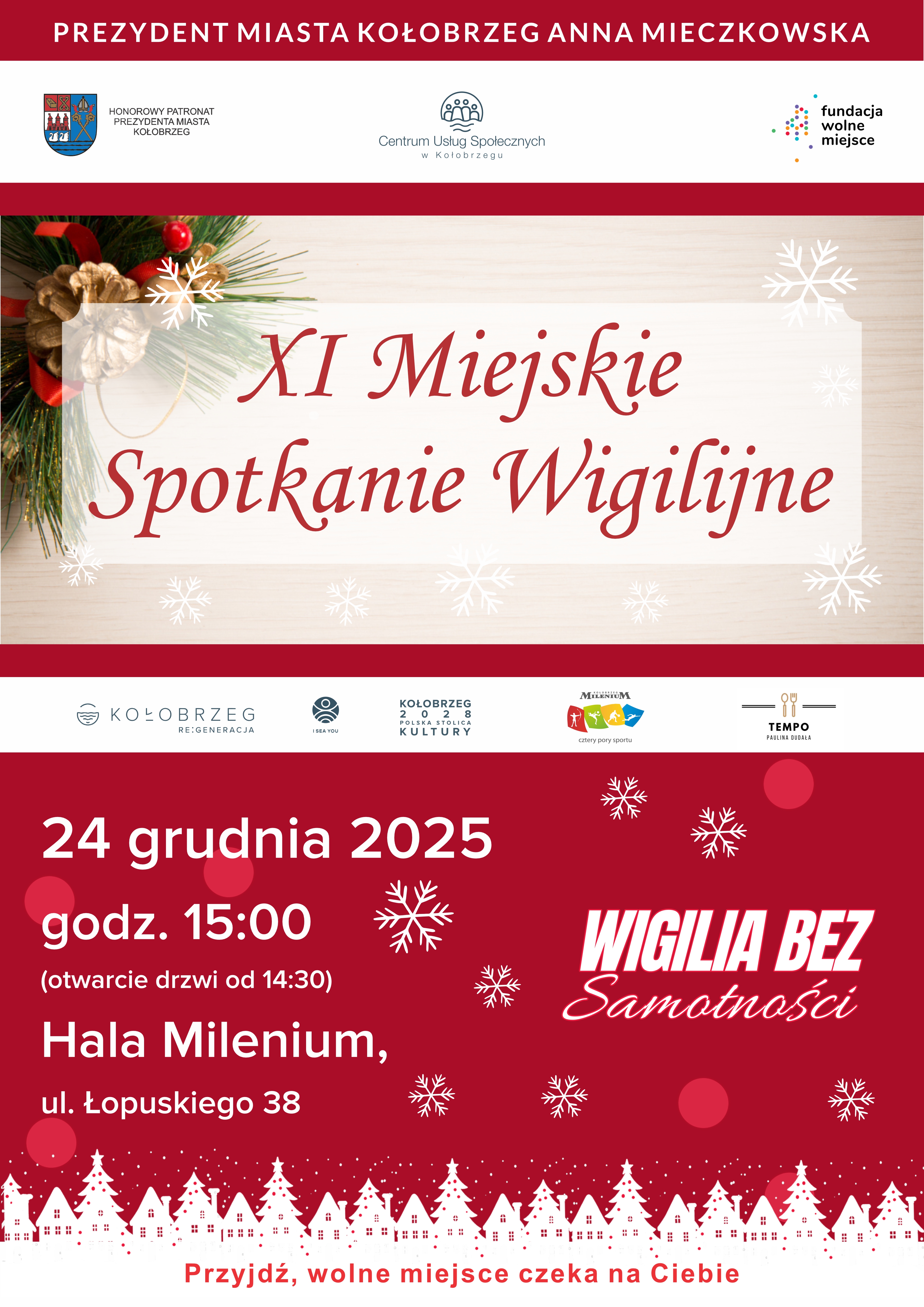 Przed nami XI Miejskie Spotkanie Wigilijne, wyjątkowe, świąteczne wydarzenie, podczas którego wspólnie przeżyjemy Wigilię Bożego Narodzenia w duchu „Wigilii bez Samotności”. Chcemy, aby nikt w tym szczególnym dniu nie był sam, by każdy mieszkaniec Kołobrzegu mógł poczuć wspólnotę, bliskość i prawdziwą magię świąt.