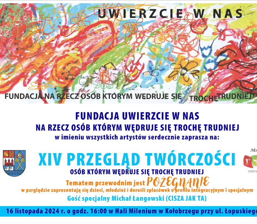Zarząd Fundacji UWIERZCIE W NAS serdecznie zaprasza na XIV Przegląd Twórczości Osób Którym Wędruje Się Trochę Trudniej, który odbędzie się 16 listopada o godz. 16. w kołobrzeskiej Hali Milenium.