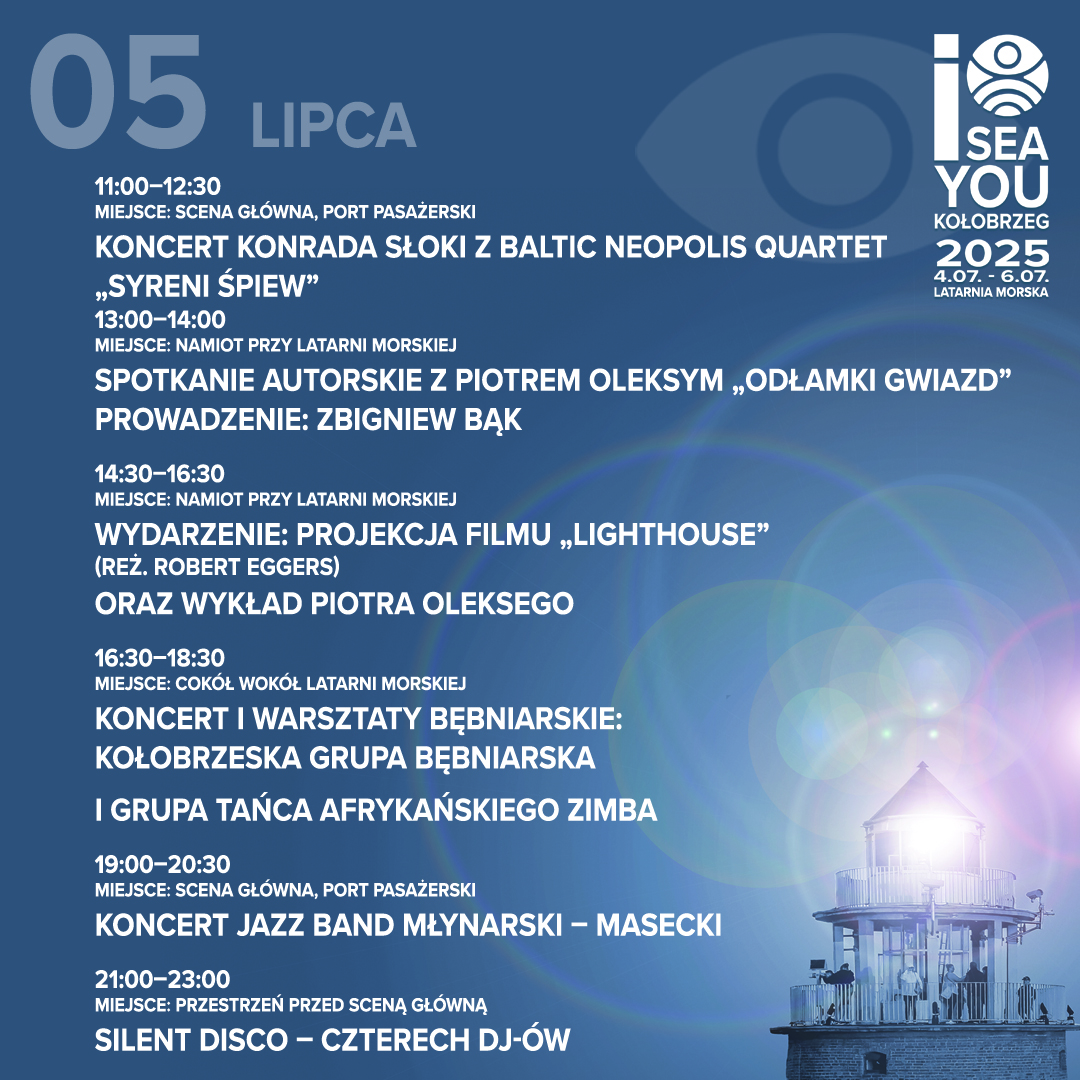 Dzień rozpocznie się nastrojowym koncertem „Syreni Śpiew” w wykonaniu Konrada Słoki i Baltic Neopolis Quartet, który wprowadzi nas w refleksyjny, morski klimat. W namiocie przy latarni odbędą się kolejne spotkania literackie – dr Piotr Oleksy zaprezentuje swoją nową książkę „Odłamki gwiazd”, a następnie poprowadzi wykład połączony z projekcją filmu „Lighthouse” Roberta Eggersa – hipnotycznego obrazu o izolacji i sile natury. Po południu przestrzeń latarni ożywi koncert i warsztaty bębniarskie z udziałem Kołobrzeskiej Grupy Bębniarskiej oraz Grupy Tańca Afrykańskiego ZIMBA. Wieczorem wystąpi charyzmatyczny zespół Jazz Band Młynarski – Masecki, który zabierze nas w muzyczną podróż do przedwojennej Polski. Na zakończenie dnia – niecodzienne SILENT DISCO: czterech DJ-ów, cztery ścieżki dźwiękowe i każdy z uczestników decyduje, co słyszy w swoich słuchawkach.