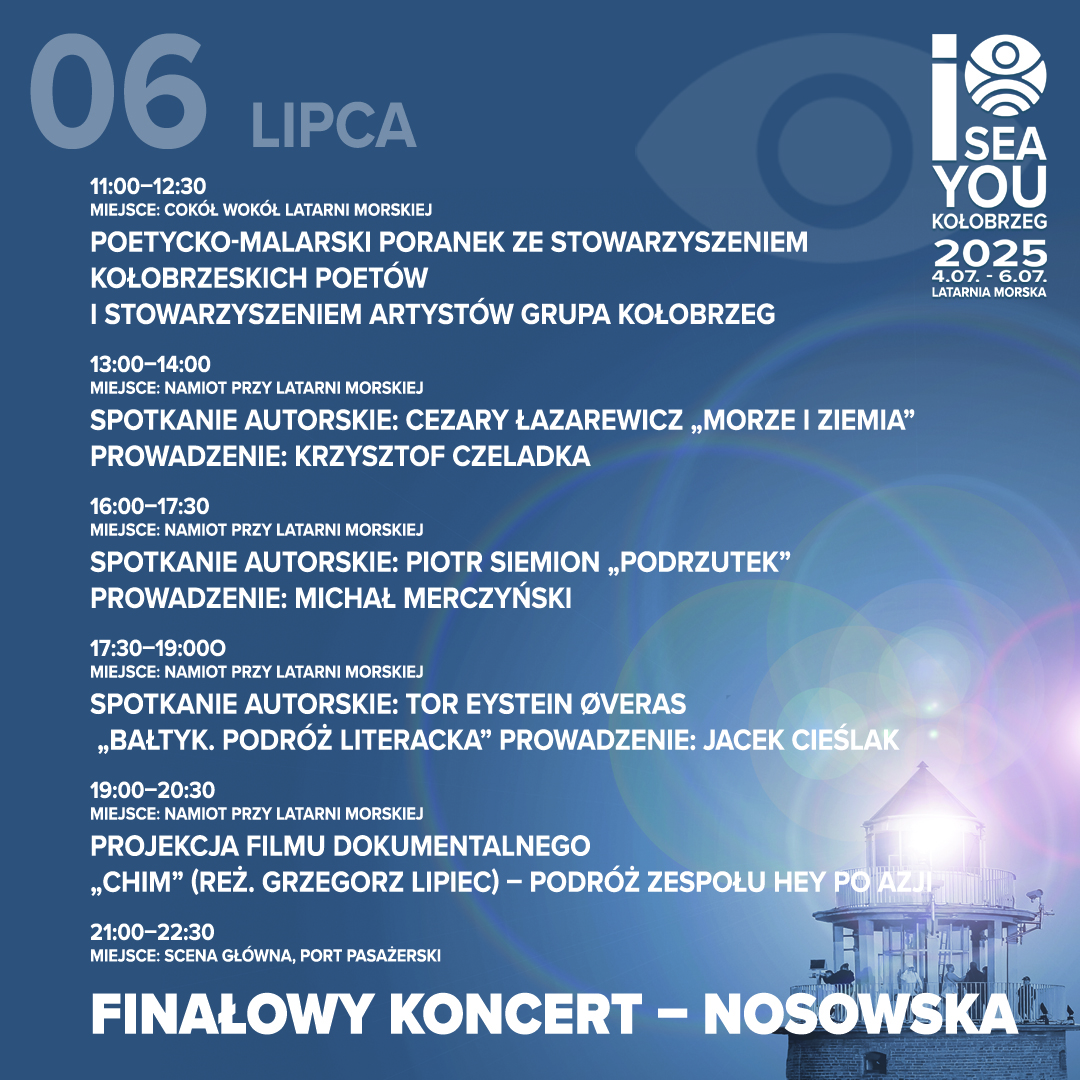 Finałowy dzień rozpoczniemy poetycko i malarsko – podczas porannego spotkania ze Stowarzyszeniem Kołobrzeskich Poetów i Stowarzyszeniem Artystów Grupa Kołobrzeg w przestrzeni wokół latarni. W namiocie literackim spotkamy się z Cezarym Łazarewiczem, autorem reportażu „Morze i Ziemia”, a później z Piotrem Siemionem, który opowie o swojej najnowszej powieści „Podrzutek”. Kolejne spotkanie poprowadzi Jacek Cieślak – rozmówcą będzie Tor Eystein Øveras, autor książki „Bałtyk. Podróż literacka”. Wieczorem odbędzie się projekcja filmu dokumentalnego „CHIM” w reżyserii Grzegorza Lipca, opowiadającego o azjatyckiej trasie zespołu Hey. Zwieńczeniem całego festiwalu będzie niezwykle oczekiwany koncert NOSOWSKIEJ na Scenie Głównej – artystki, która po raz kolejny udowodni, że muzyka potrafi poruszyć najgłębsze emocje.