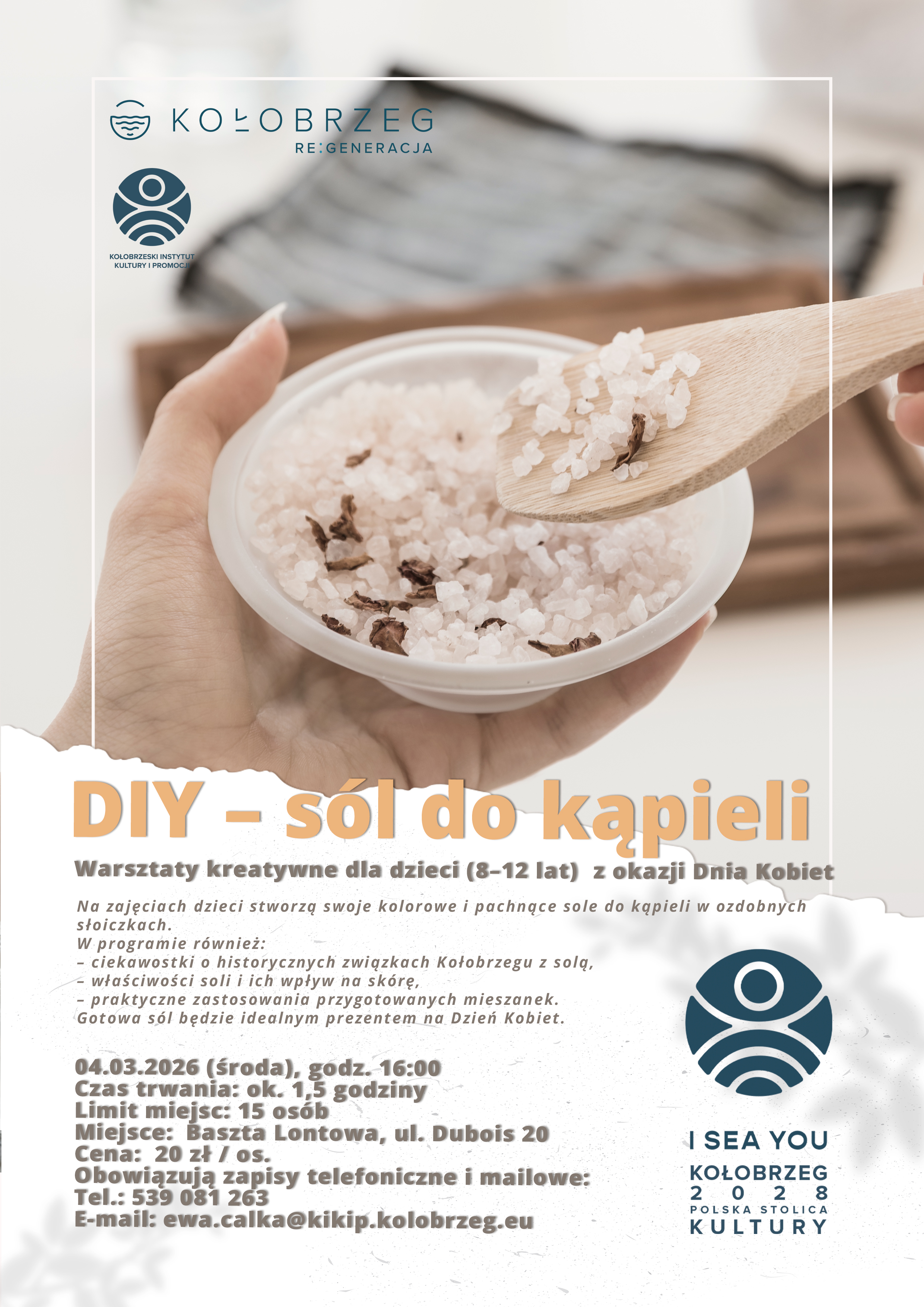 Pierwszego dnia (środa, 4 marca) uczestnicy wezmą udział w warsztatach DIY, podczas których przygotują kolorowe i pachnące sole do kąpieli w ozdobnych słoiczkach. Oprócz części praktycznej dzieci poznają ciekawostki dotyczące historycznych związków Kołobrzegu z solą, jej właściwości oraz wpływu na skórę. Własnoręcznie wykonane mieszanki będą mogły stać się oryginalnym prezentem z okazji Dnia Kobiet.